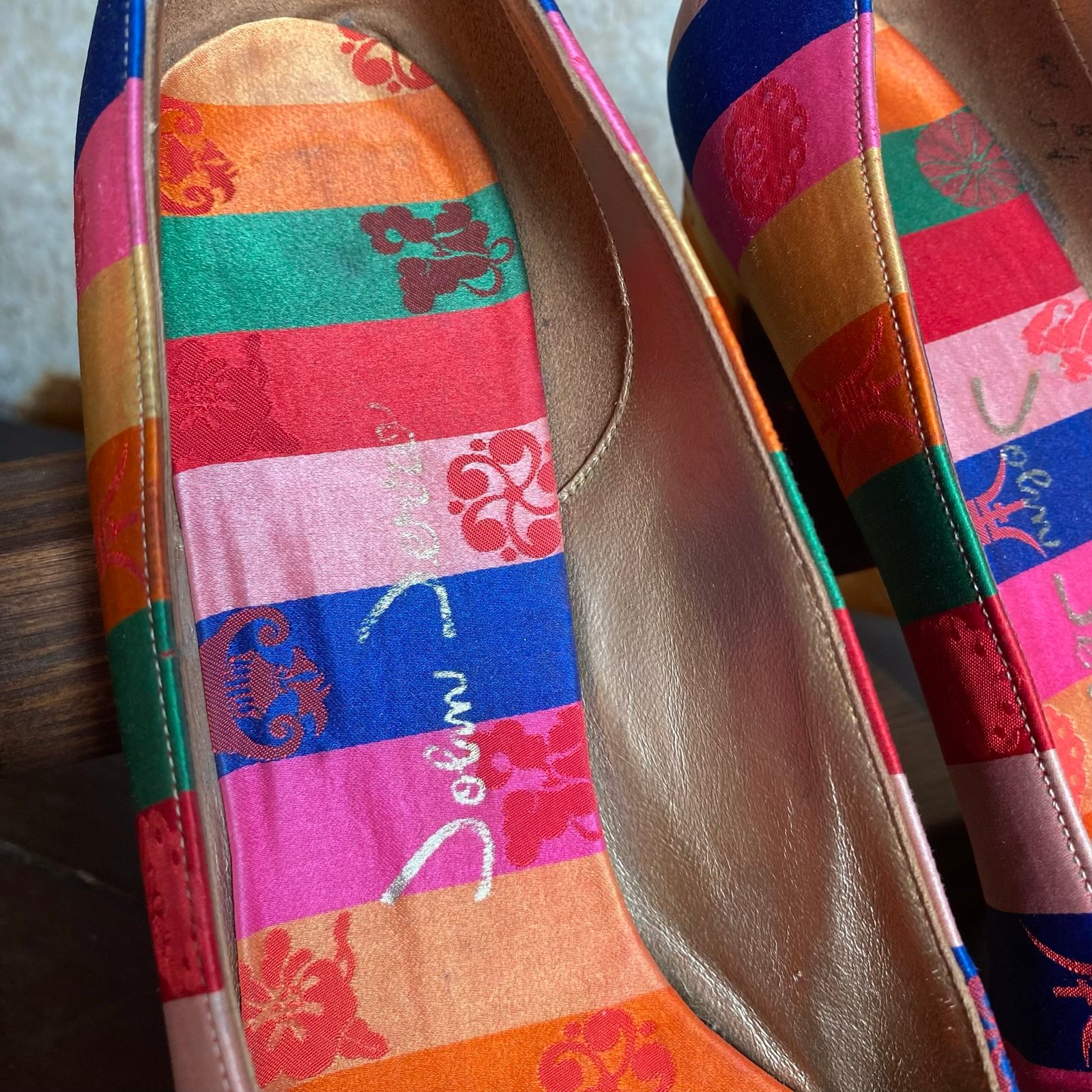 Gorgeous bright rainbow stripe vintage shoes by John Jerro. Oriental style pattern throughout with squares off toe and small block heel. Leather upper and sole, with satin fabric covering to the upper. In lovely vintage condition. Size is a narrow UK size 4 with a 2” heel. Measures 3” wide at the widest part of the foot (around the ball of the feet).