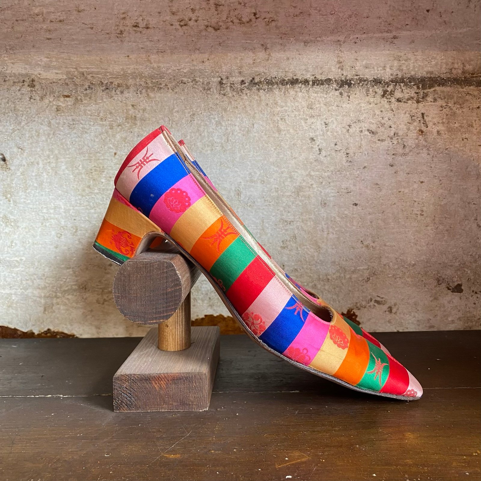 Gorgeous bright rainbow stripe vintage shoes by John Jerro. Oriental pattern to the stripe. Leather. Size is a narrow UK size 4 with a 2” heel.