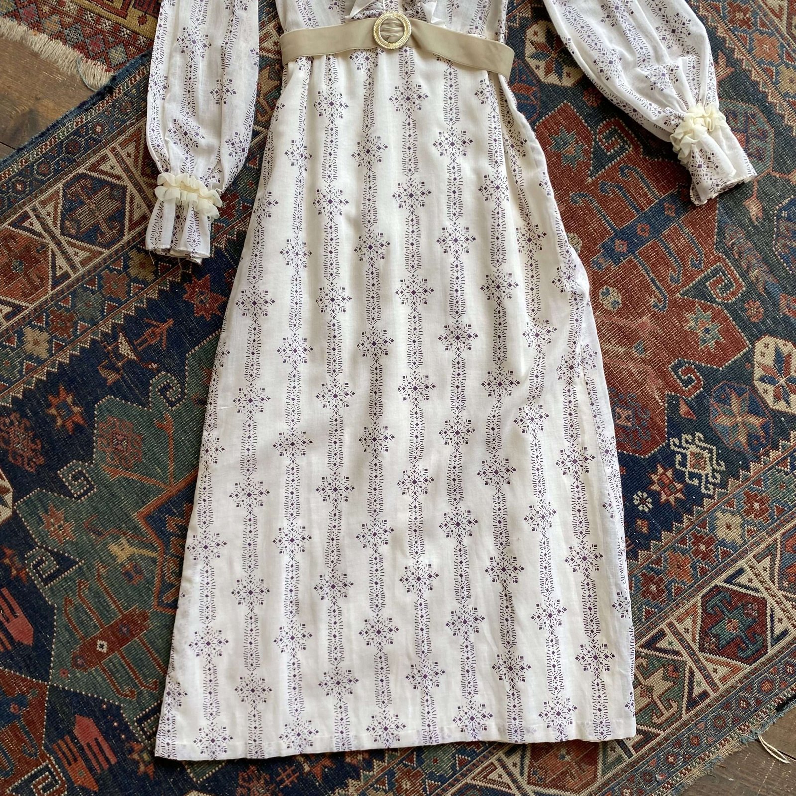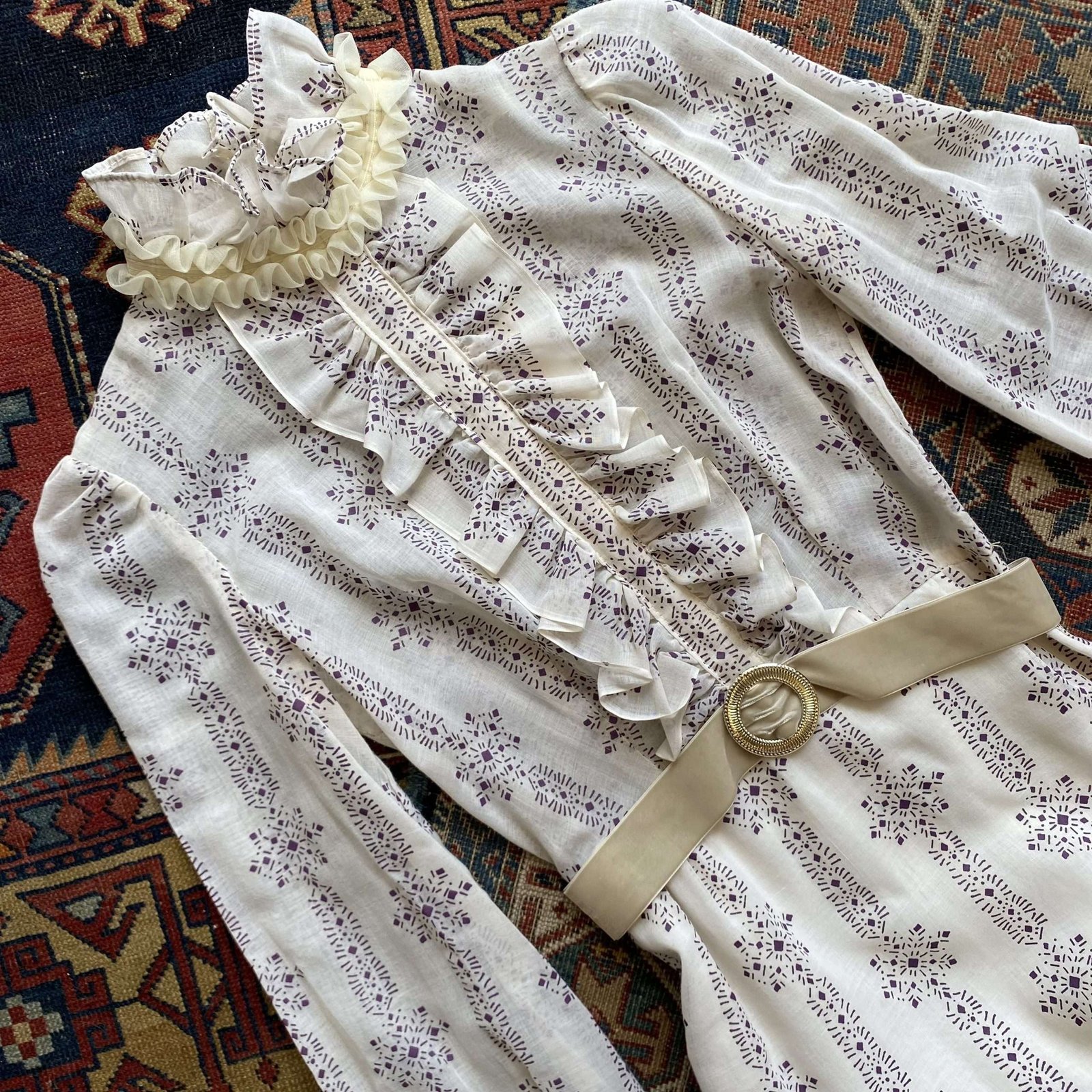 Super pretty Ruffle detail vintage prairie maxi dress with velvet belt detail to the waist and gorgeous ruffles to the front, neckline and cuffs. Delicate gauze fabric with purple geometric print. Very Victorian in style. Centre zip back fastening with hook and eyes to the collar. This is a very slim fitting pieces and there is zero stretch to the fabric. Skirt is fully lined but the bodice is semi sheer. In lovely vintage condition. Fits a UK 6. Please check below measurements before purchasing.