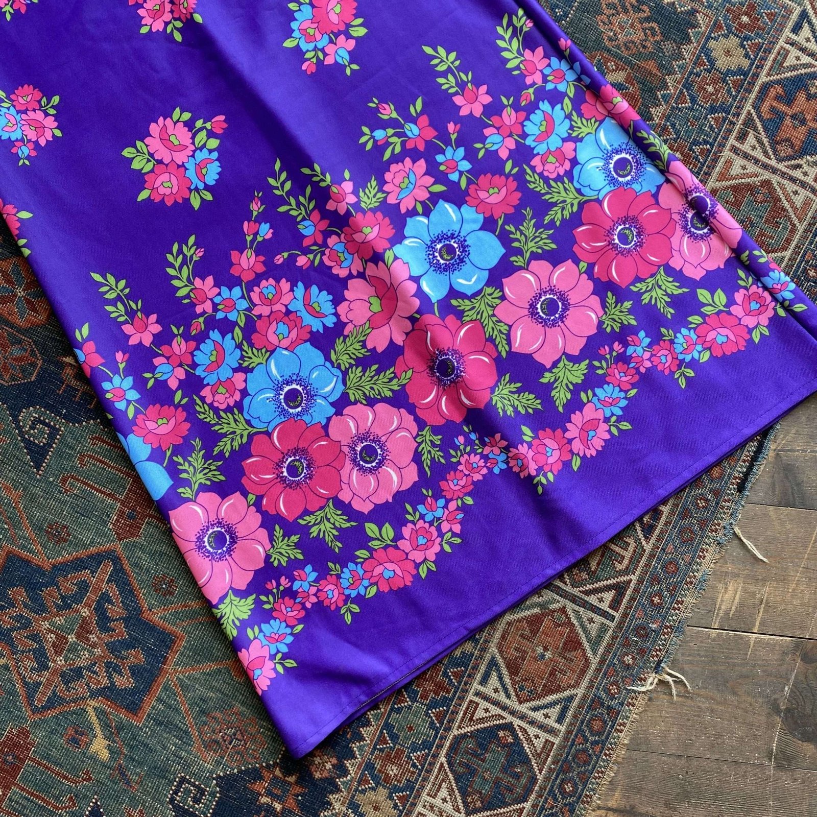 Awesome Cadburys purple vintage maxi dress with bright pink and blue flowers. Heavily bordered print to the bottom with a scattered posey print to the rest of the dress. Darted to the bust to give a fitted shape, with straps to the shoulders. Fabric is a synthetic crimplene type fabric, no composition labels inside. In great vintage condition. Perfect for festival season! Sized as a UK 14. Please check below measurements before purchasing.