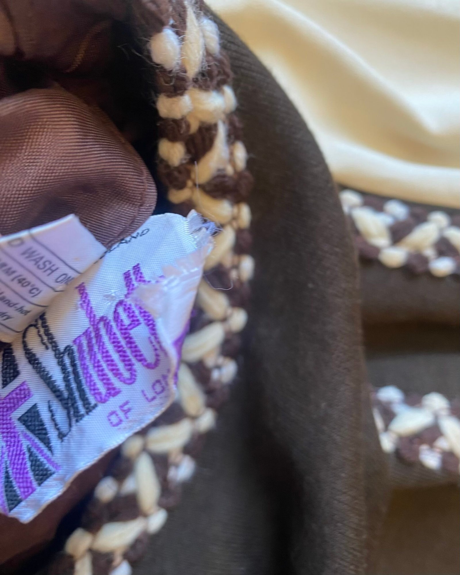 An amazing 1960s vintage prairie dress by Shubette of London. Gorgeous dark brown and cream colour way with contrast crépe sleeves and woollen braided detailing to the bodice and skirt hem. Main body is a mid/heavy weight knitted jersey style fabric, with crépe sleeves and wool trim. Chunky metal centre back zip fastening with hook and crochet loop to the neckline. Fitted bodice with a long a-line shaped maxi skirt. Flutter style cuffs on a subtle bishop style sleeve. Cuffs fasten with a press stud. Unlined. A great piece with a pair of cowboy boots! In lovely vintage condition. Sized as a UK 8 to 10. Some firm stretch to the jersey fabric. Please check below measurements before purchasing.