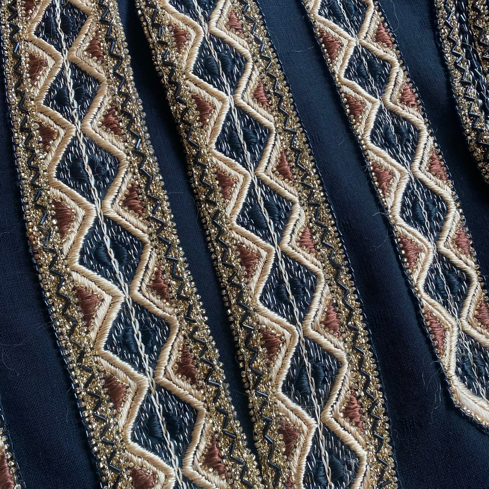 Lovely vintage blouse in a lightweight black woven jacquard fabric with gold, black and brown trim to the chest and cuffs. Plain to the back. Jacquard pattern is tiny woven squares (see pics). Trim is embroidered with beads. Deep keyhole neckline with a single button to fasten at the top. Balloon style sleeves with a fitted gold trim cuff and gathered at the shoulders. Panelling to the front to give a more fitted shape to the bodice. No composition labels, but fabric has a cotton/linen feel. In great vintage condition. Sized as an UK 8. Please check below measurements before purchasing.