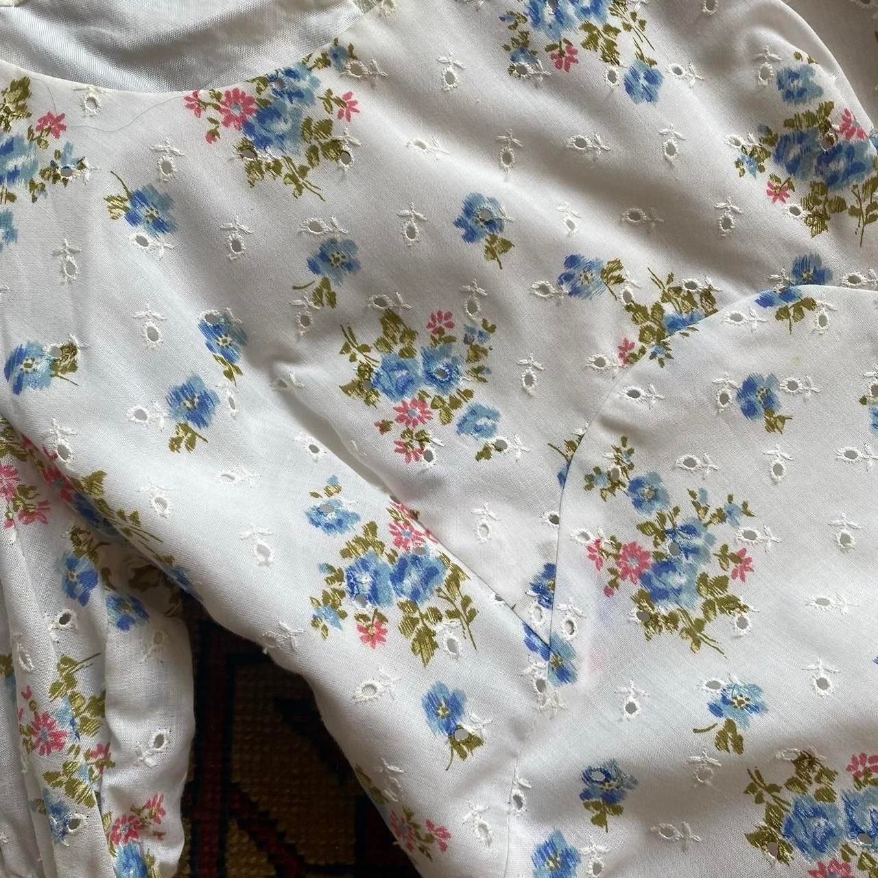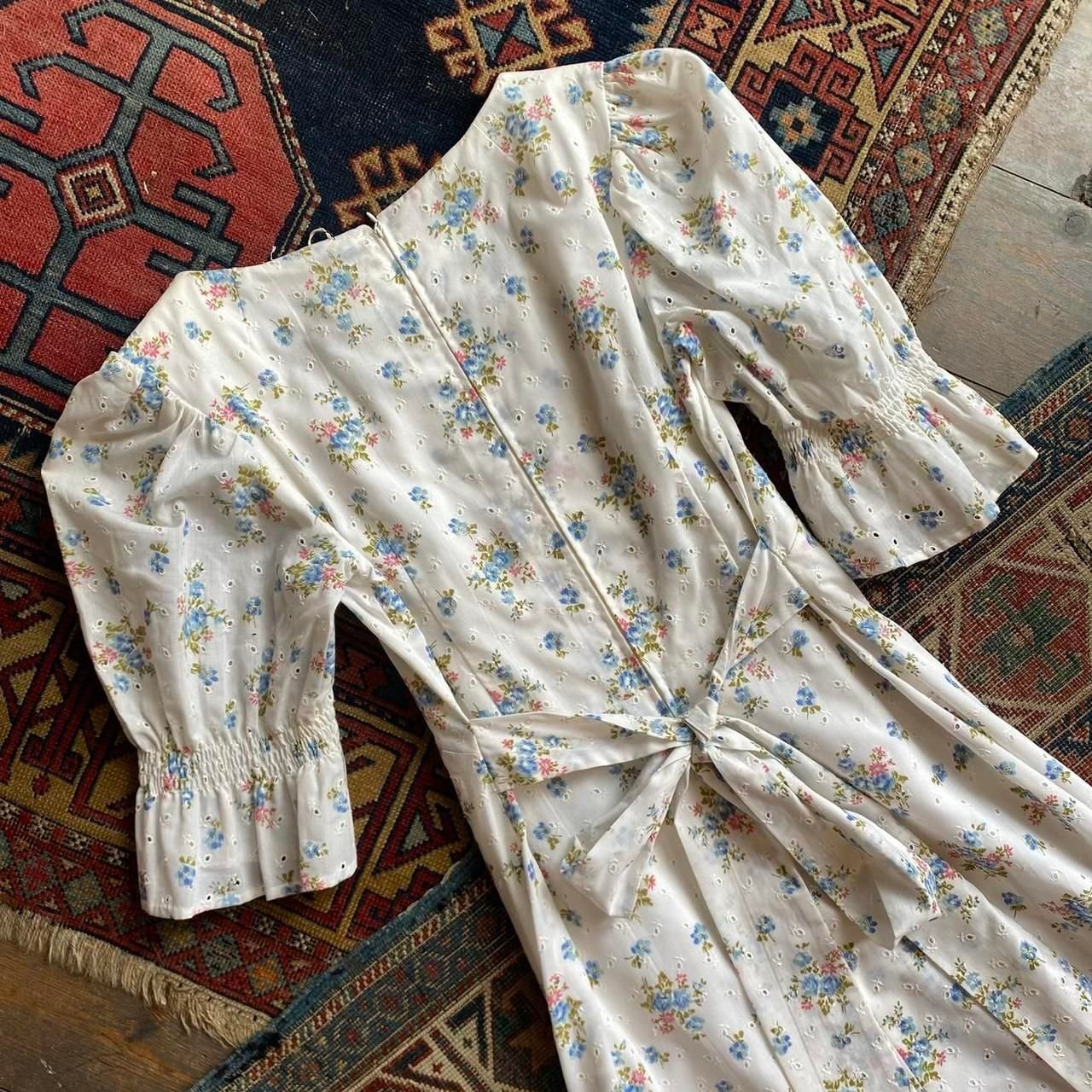 1970s Floral Broderie Anglaise Puff Sleeve Prairie Vintage Maxi Dress. UK 6/XXS.