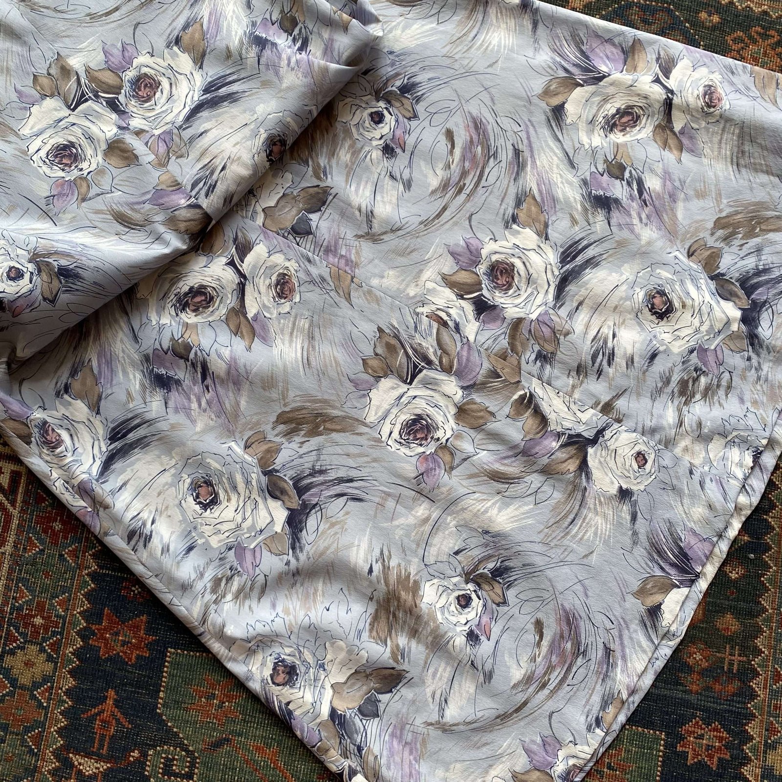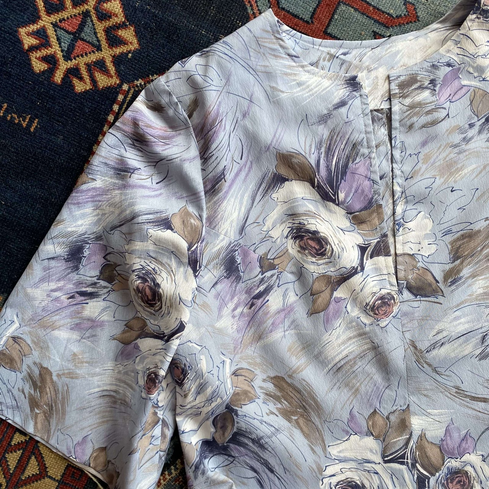 Vintage kaftan with cabbage rose print in shades of lavender and lilac. A-line shape with bust darts . Loose half sleeves. V notch neckline. Size Small/UK 10.