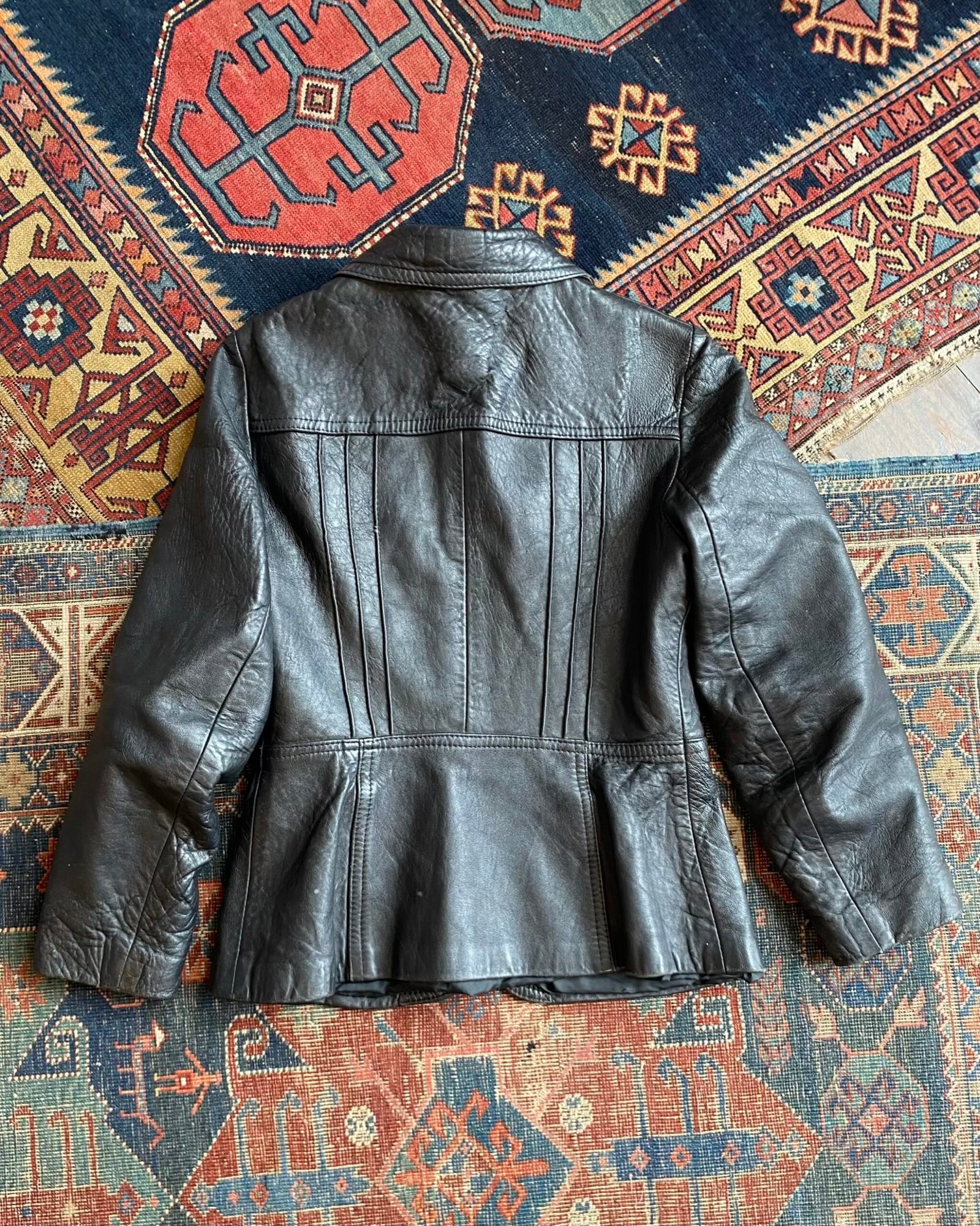 Super soft vintage leather jacket with front and back pin-tuck detail pleats and chunky zip front. Lovely 70s style collar and peplum style hem. Small.