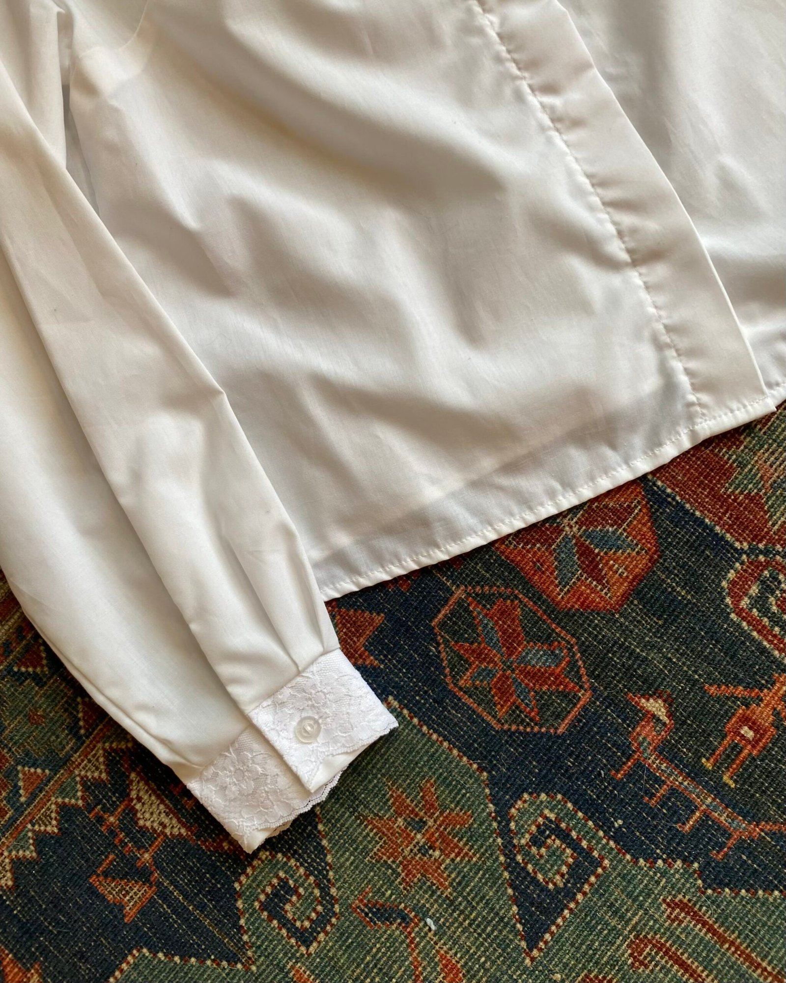 Amazing dramatic button front vintage blouse with removable lace ruffle detail. Stand up mandarin style collar with lace overlay. Lace overlay cuffs with button fastening. Ruffle front is removable, it attaches on to the front buttons. Fabric is 65% Polyester/35% Cotton with zero stretch. Nice and light weight. Straight fit sleeves with a fitted cuff. Darted to the bust, but an otherwise boxy shaped fit. In nice vintage condition. Sized as a UK 16. Please check below measurements before purchasing.