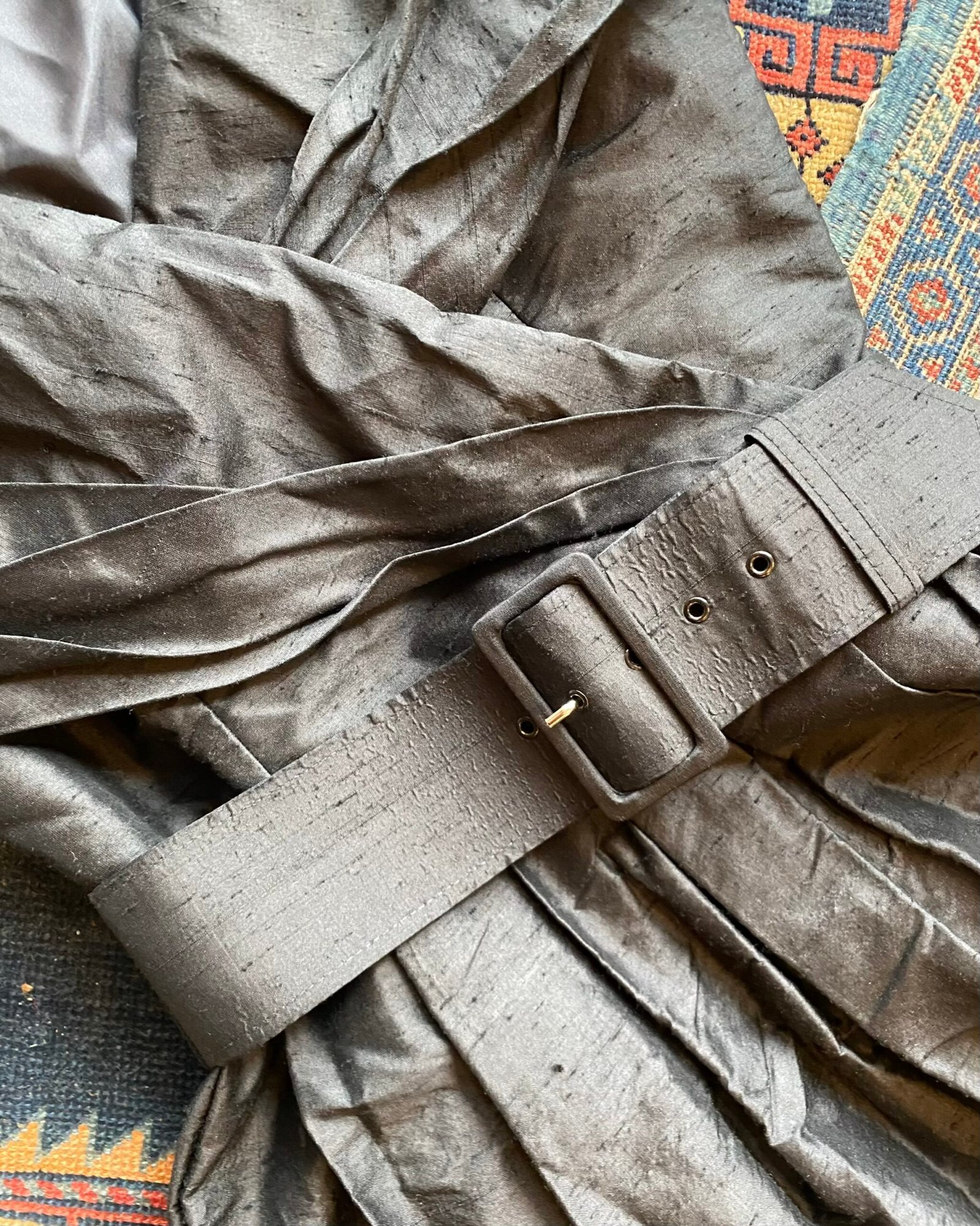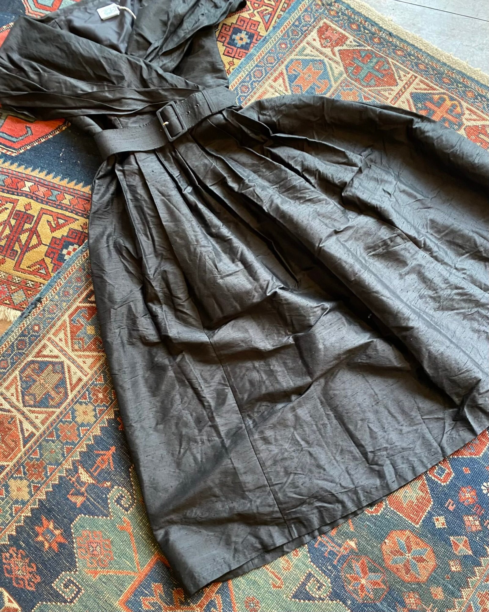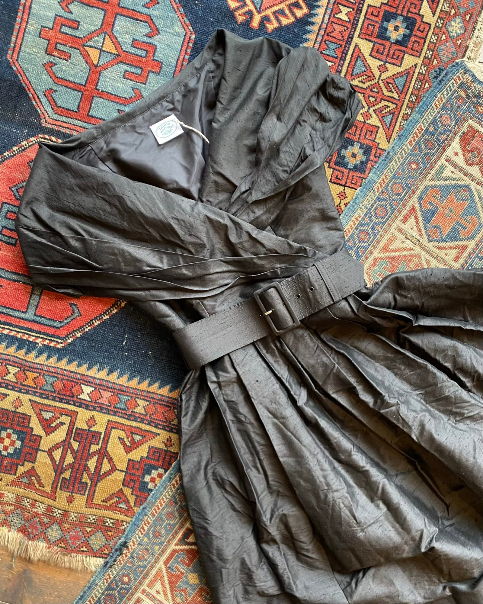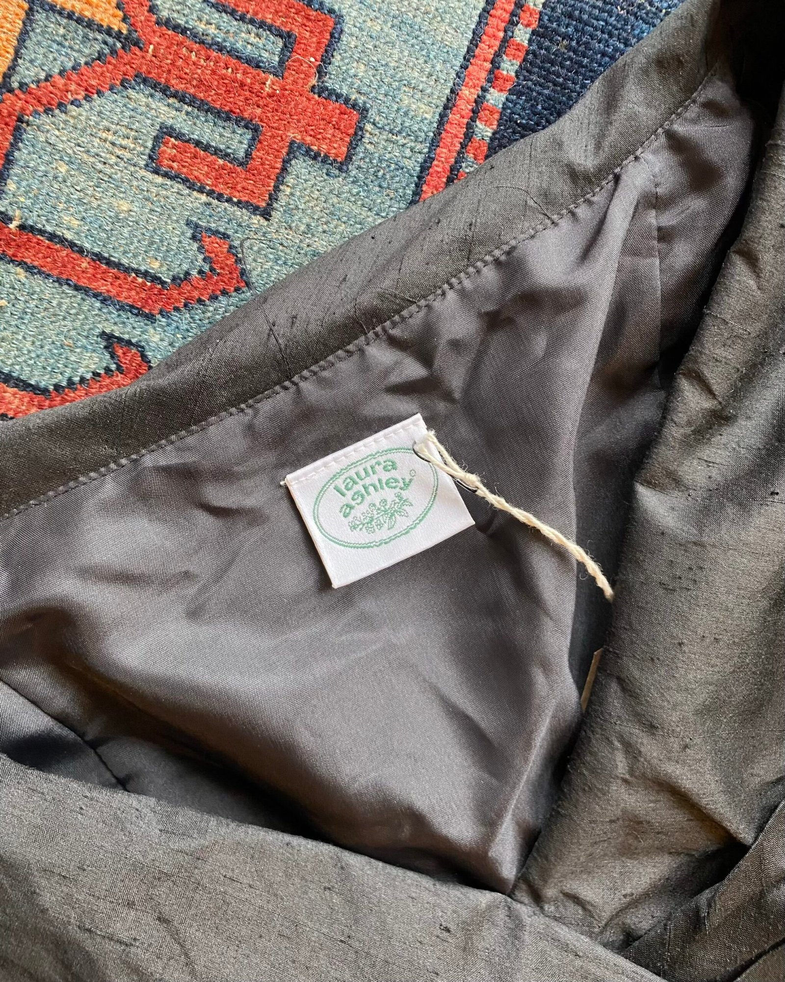 So Audrey Hepburn! Gorgeous 1980s vintage Laura Ashley belted wide shawl collar cocktail dress. Belted to the waist with a full skirt and beautiful shawl collar with a wide v-neckline. Giving 50s Hollywood vibes all day long! Stunning rich black 100% slub ‘Dupion’ silk. Lining to the upper bodice. Perfect for a special occasion. In beautiful vintage condition. Sized as a UK 8 on the original label, fits quite small particularly around the rummage. Please check below measurements before purchasing.