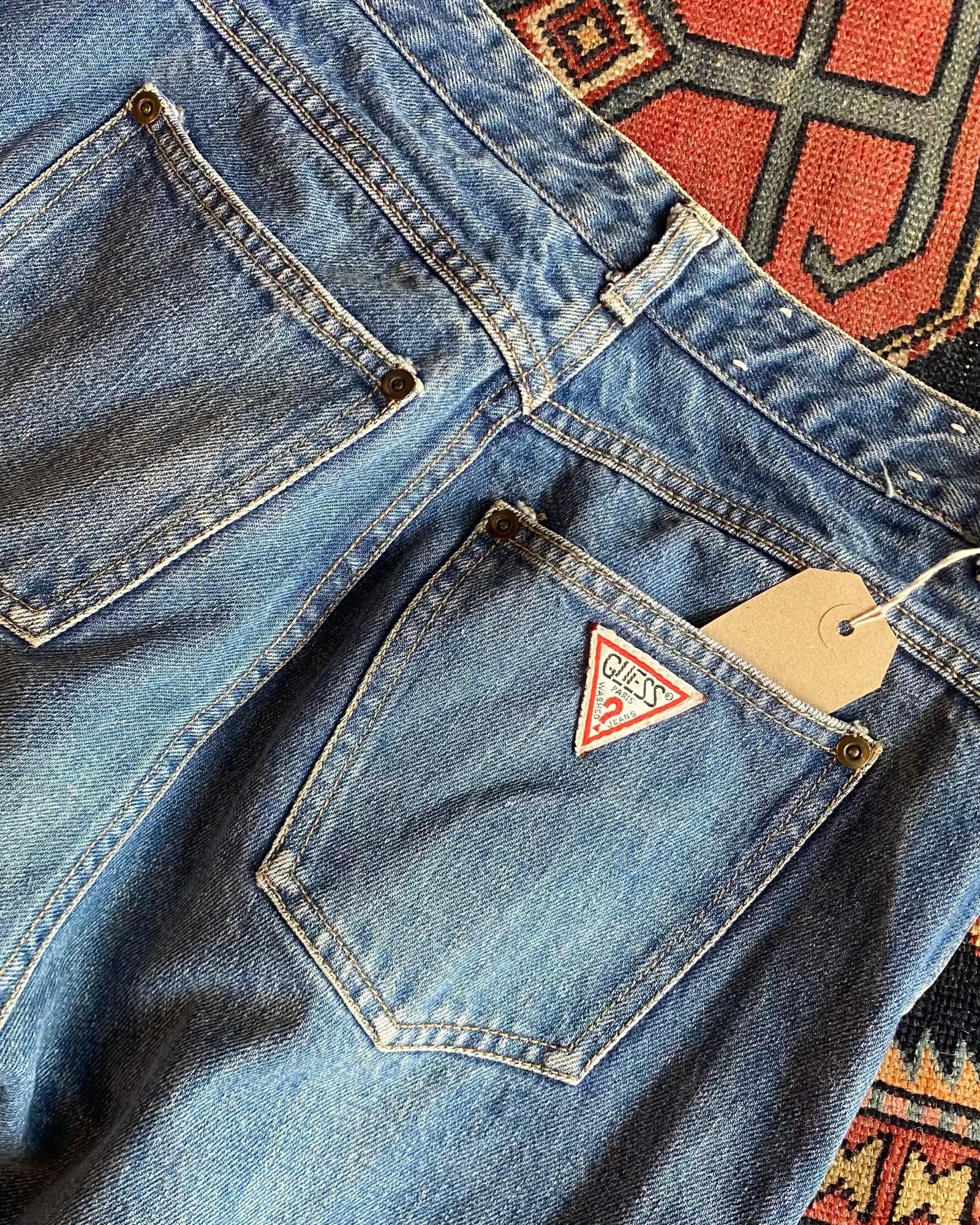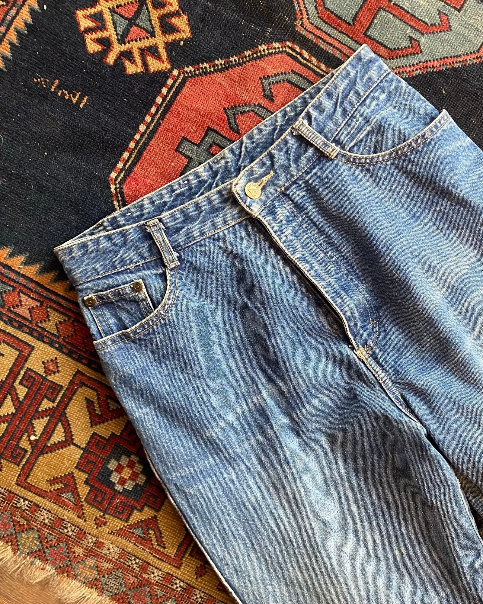 Lovely stonewashed, high waisted vintage jeans by Guess. Zip fly with waist button and classic 5 pocket style. A great shape that curved in to the waist for a nice fitted style. Really nice natural wear to the denim throughout (see pics). In nice vintage condition. Sized as a UK 12 with a 30” waist. Please check below for full detailed measurements before purchasing.