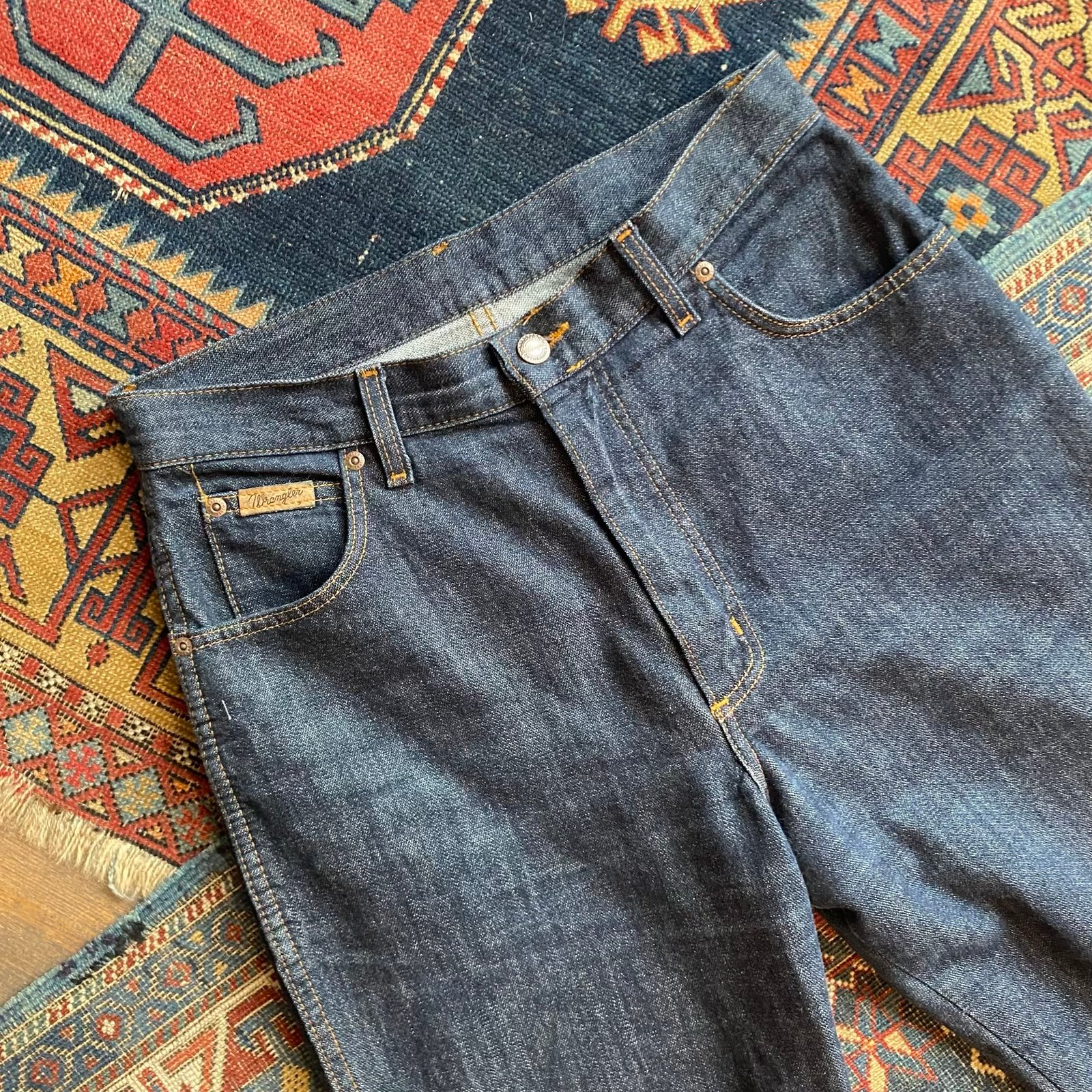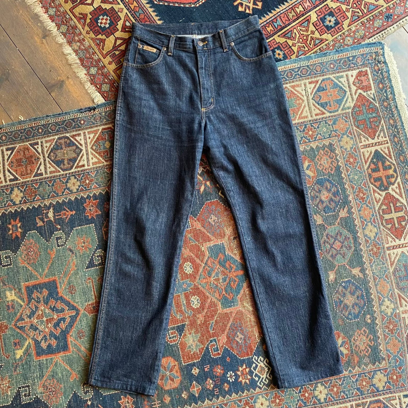Rare Wrangler ‘Broken Twill’ vintage jeans. Great soft dark raw denim with contrast copper stitching. Zip front fastening and classic denim waistband button. 5 pocket design and straight leg fit. Leather logo patch to the back pocket. In great vintage condition. Sized as a UK 12 with a 31” waist (might work for someone in between sizes too). Please check full measurements below before purchasing.