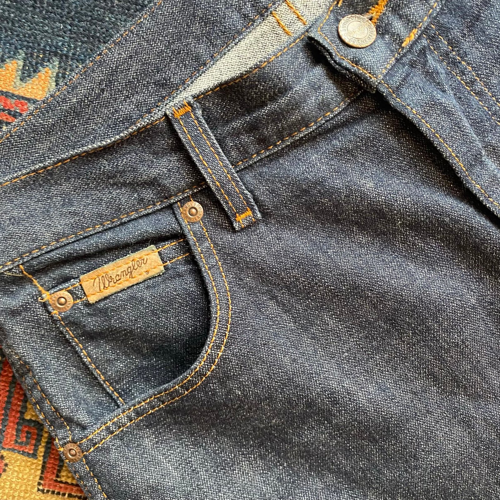 Rare Wrangler ‘Broken Twill’ vintage jeans. Contrast copper stitching. Zip fly and 5 pocket design and high waist straight leg fit. UK 12 /31” waist.