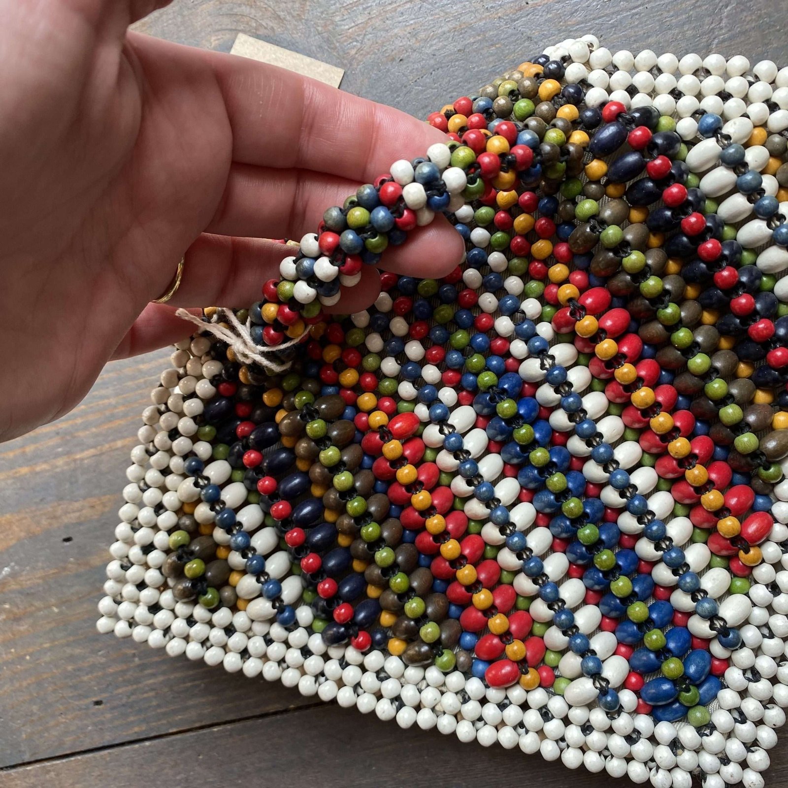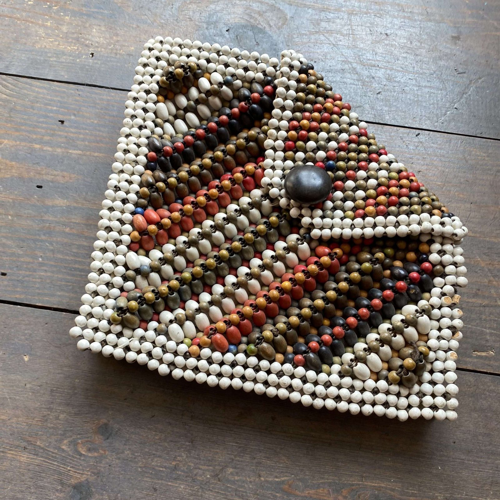 Beautiful antique 1930s colourful wooden beaded outer with inner lining. Press stud fastening with big wooden button. Finger strap to the back for easy holding.