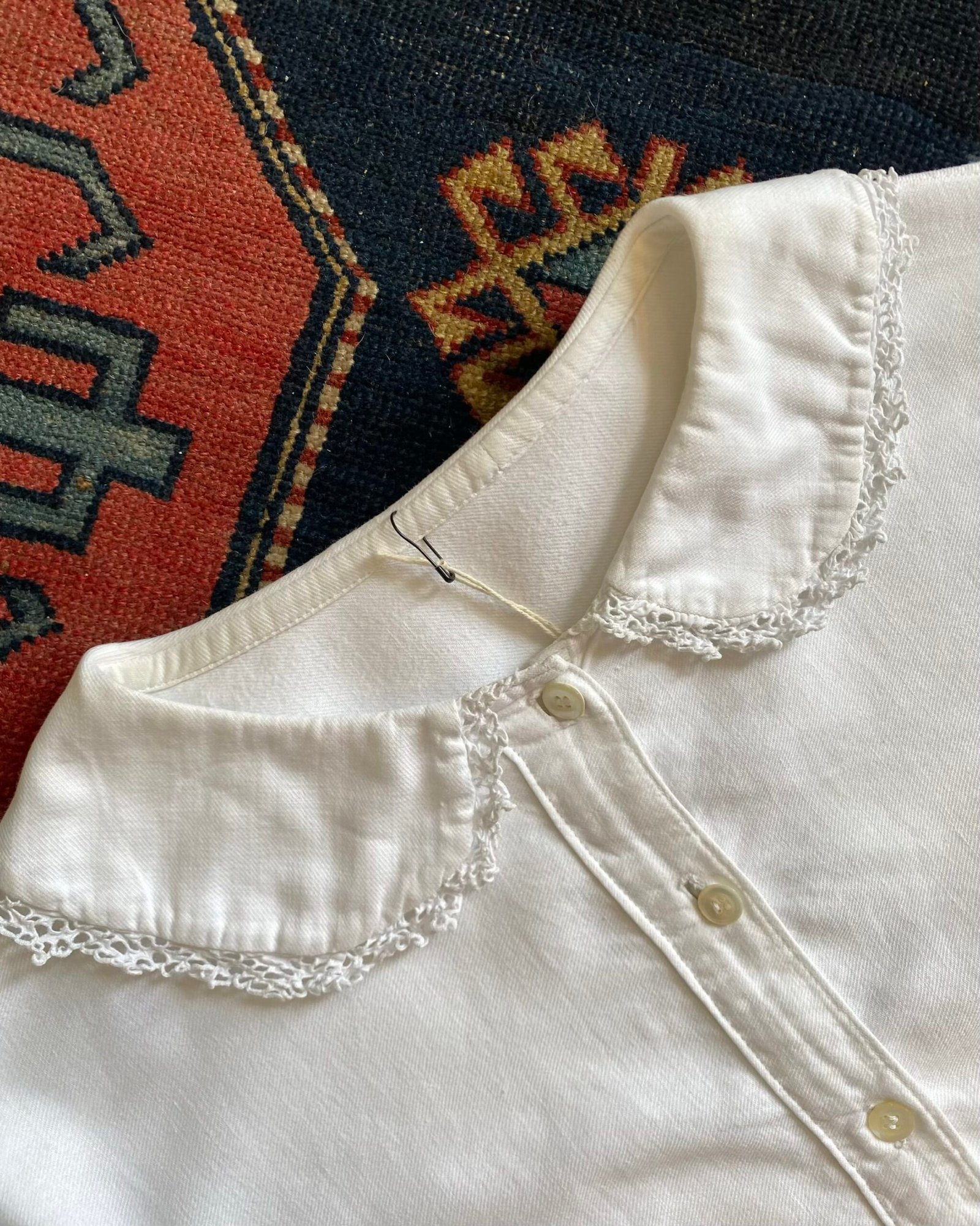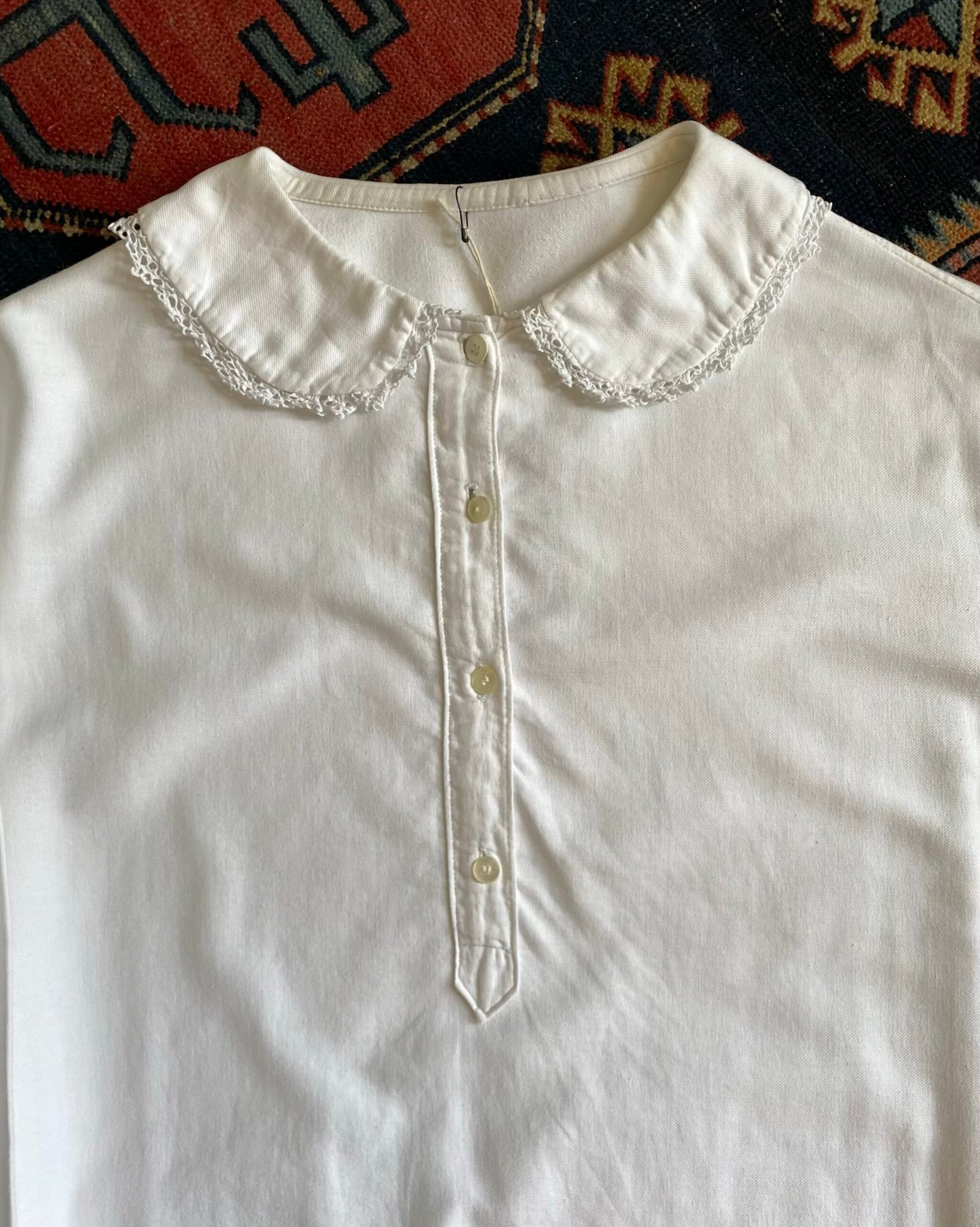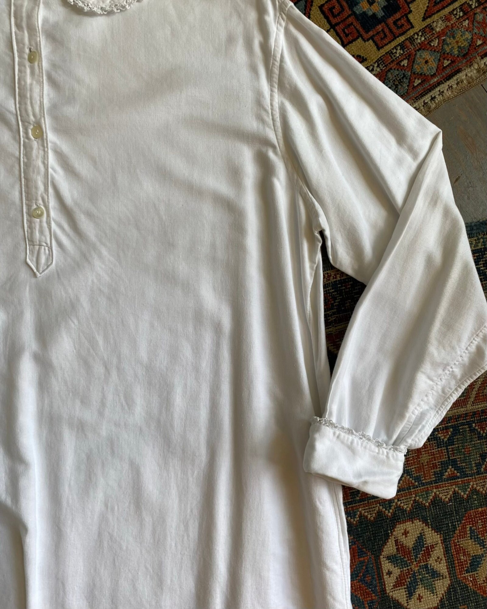 Gorgeous 1900s/1910s Antique French linen mid calf length smock night gown. Peter Pan style collar with lovely lace trim and front button opening. Size XL/18.