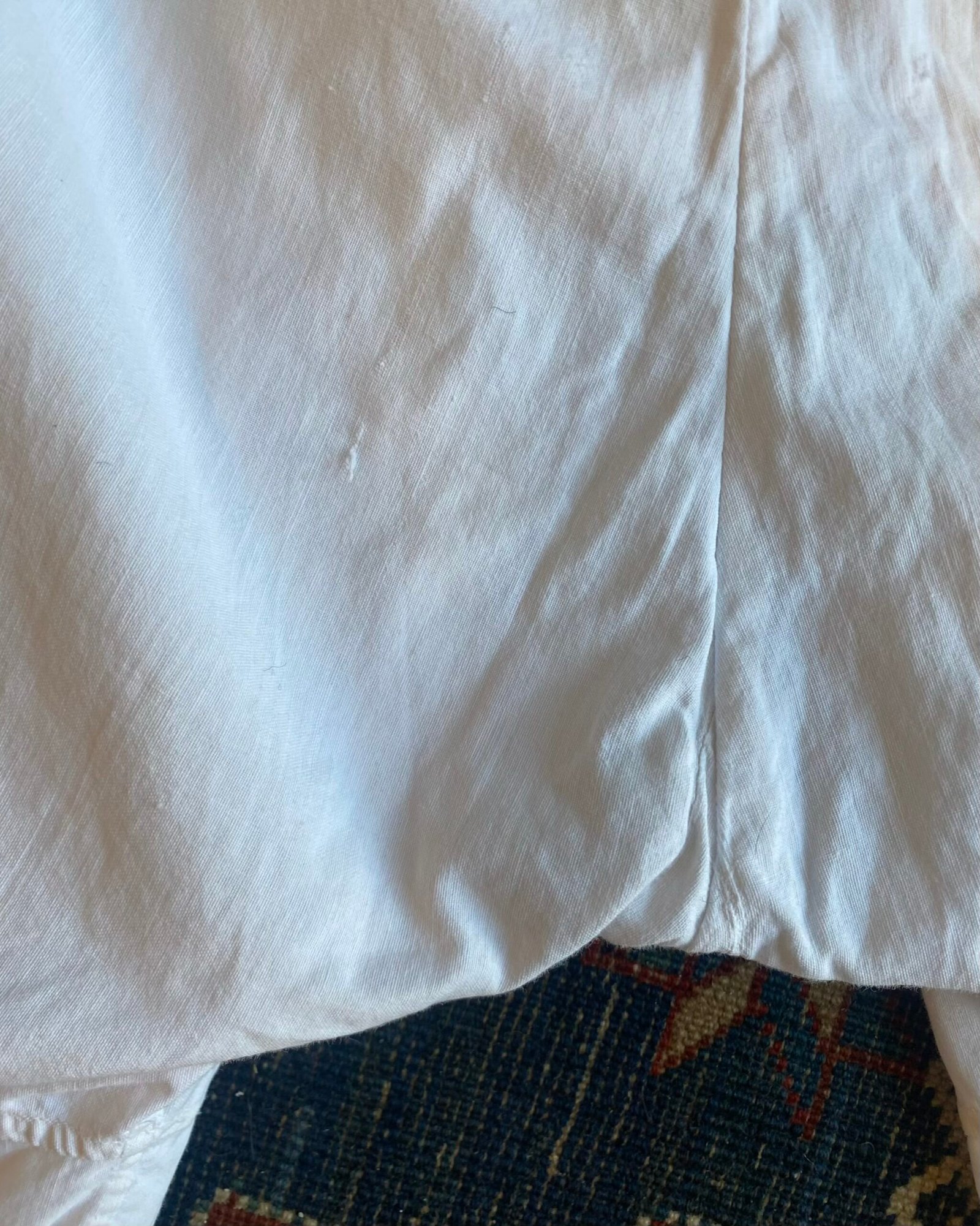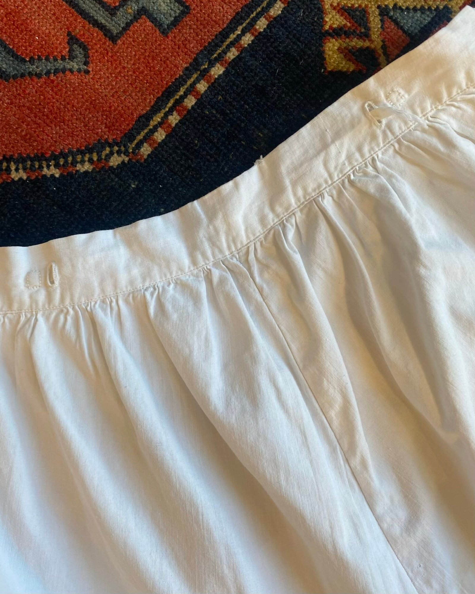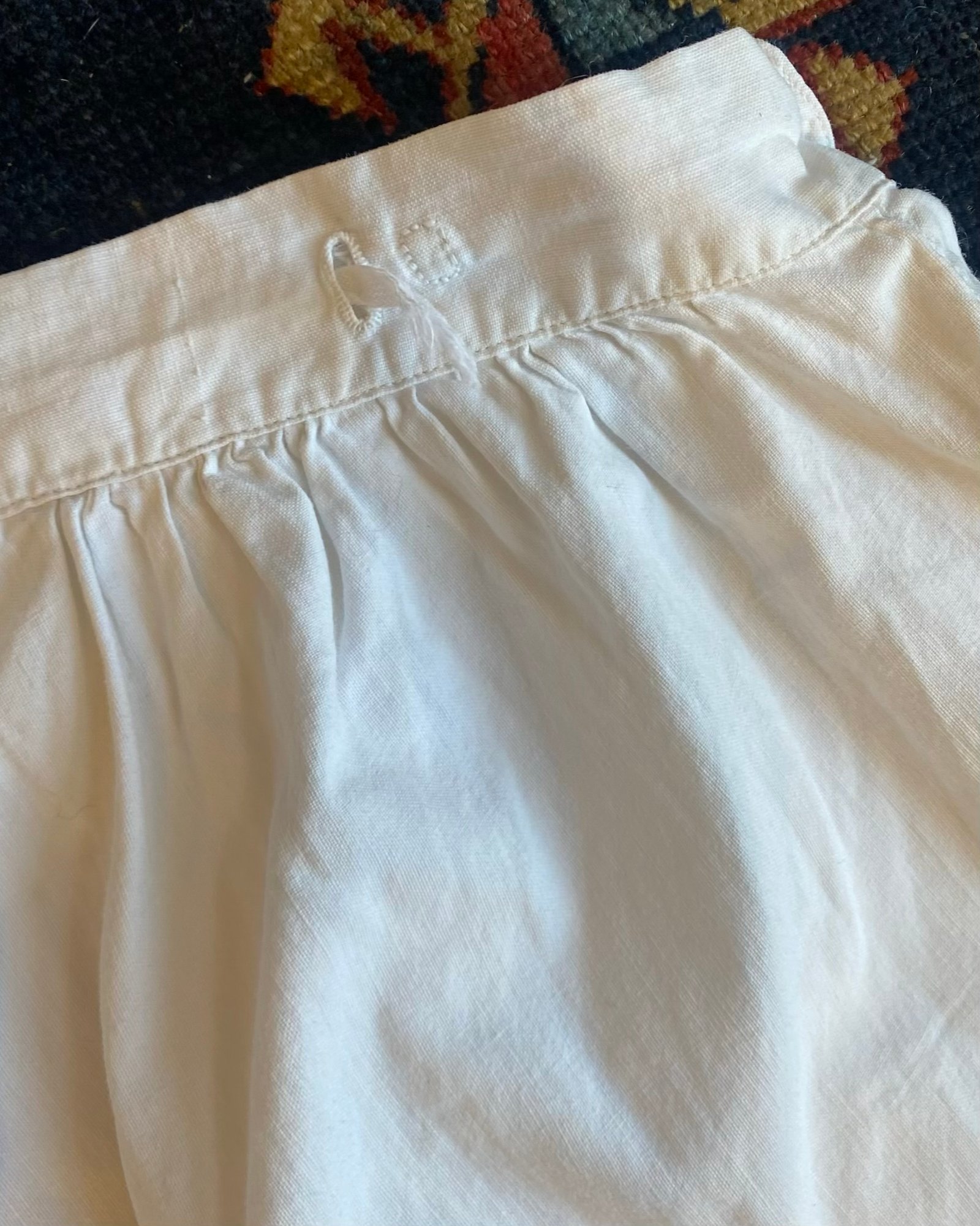 Lovely French Broderie Anglaise trim antique bloomers. Estimated 1830s to 1900s, these were originally a pair of “Split drawers”. UK 6 – 8.
