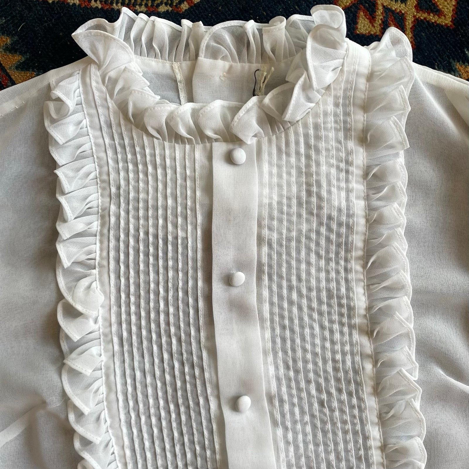Vintage blouse in white sheer gauze type fabric with pintuck and ruffle front detail. Ruffles to the neckline and cuffs. UK 16.