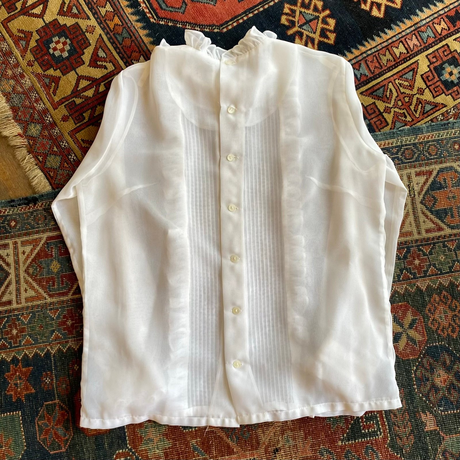 Vintage blouse in white sheer gauze type fabric with pintuck and ruffle front detail. Ruffles to the neckline and cuffs. Decorative buttons to the front. Button fastenings to the back. Darted to the bust but otherwise boxy in shape. In nice vintage condition and perfect for layering up. Sized as a UK 16. Please check below measurements before purchasing.
