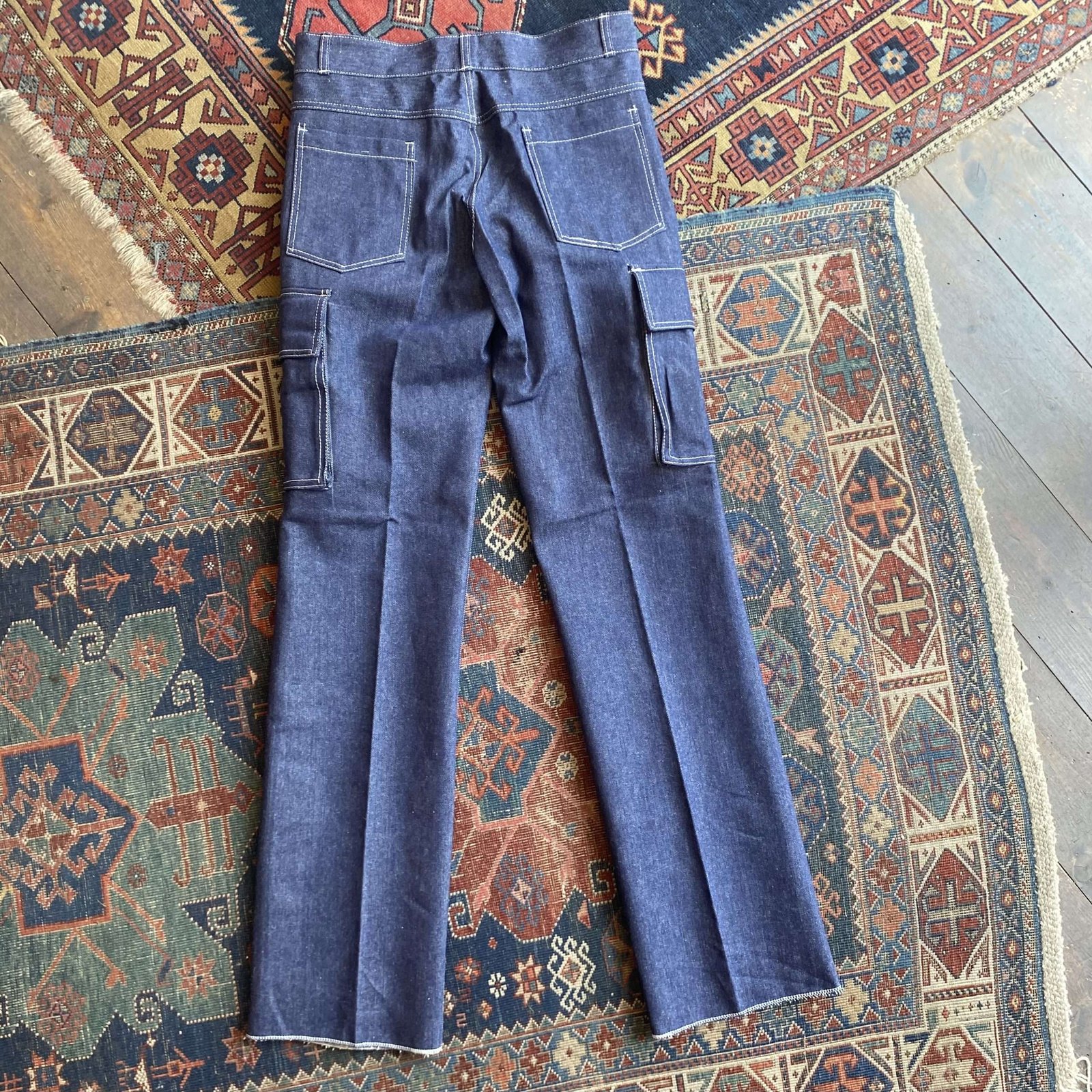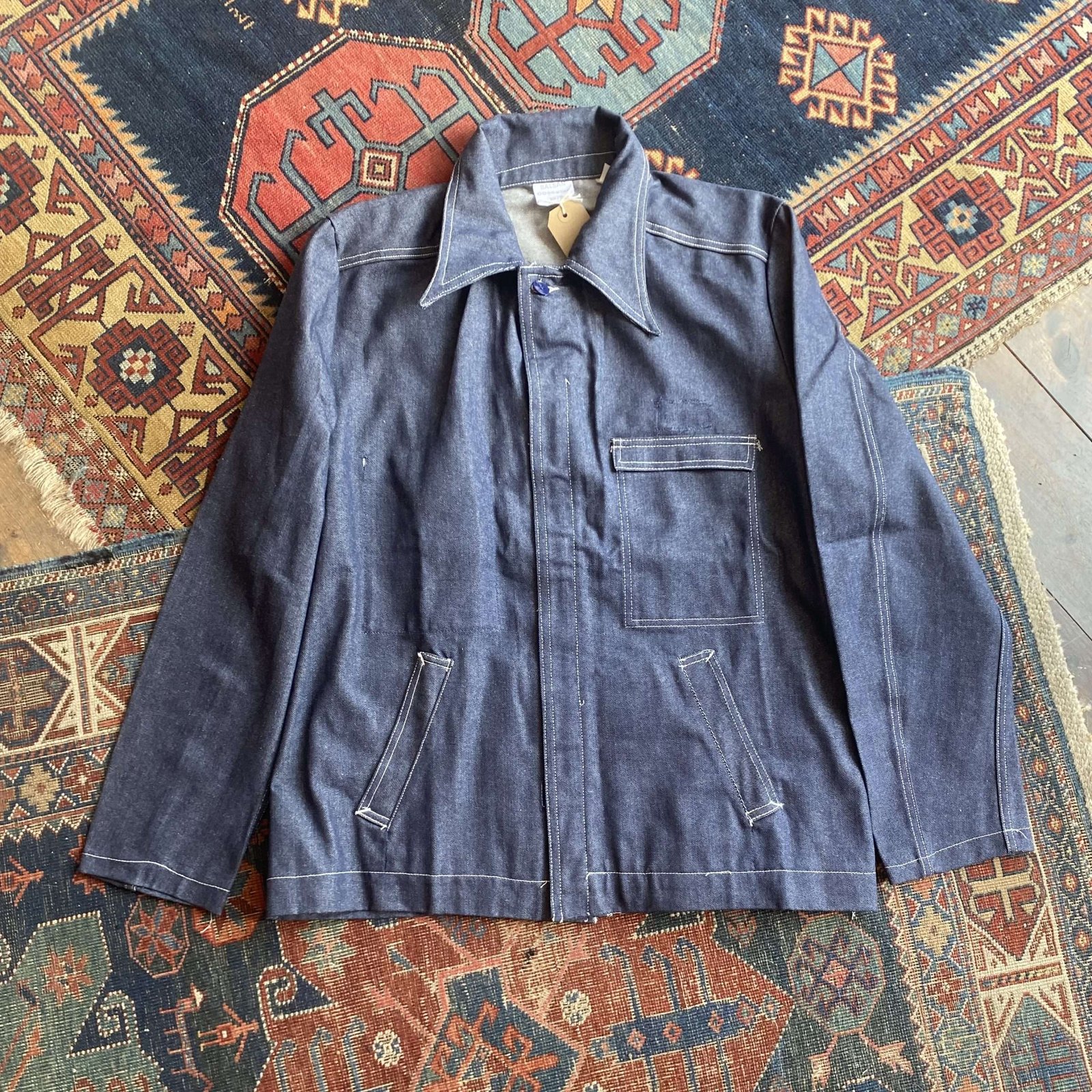 We love this one! Denim vintage workwear suit dated 1979 and made in France. Deadstock unworn condition! Lovely contrast stitching throughout. Wing collar to the jacket with concealed zip front fastening. Carpenter style jeans with pressed front seam. Jeans have not been hemmed as its unworn, so have an overlocked finished edge, can be hemmed to whatever length you need. Has had patches on the jacket and trousers, that have since been removed. Indigo raw denim, so it’s stiff, but will wear beautifully when worn in. 100% cotton. This will look perfect with one of our 70s tees. Please check below measurements before purchasing.