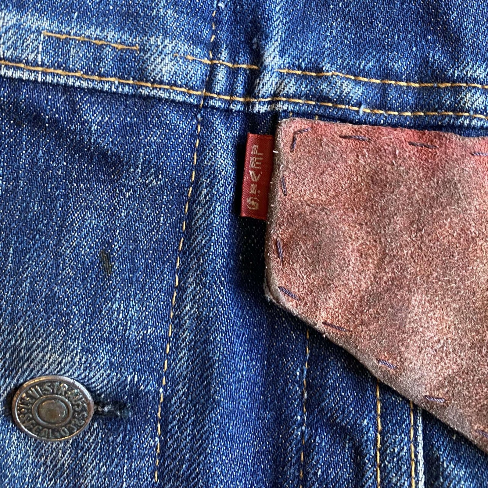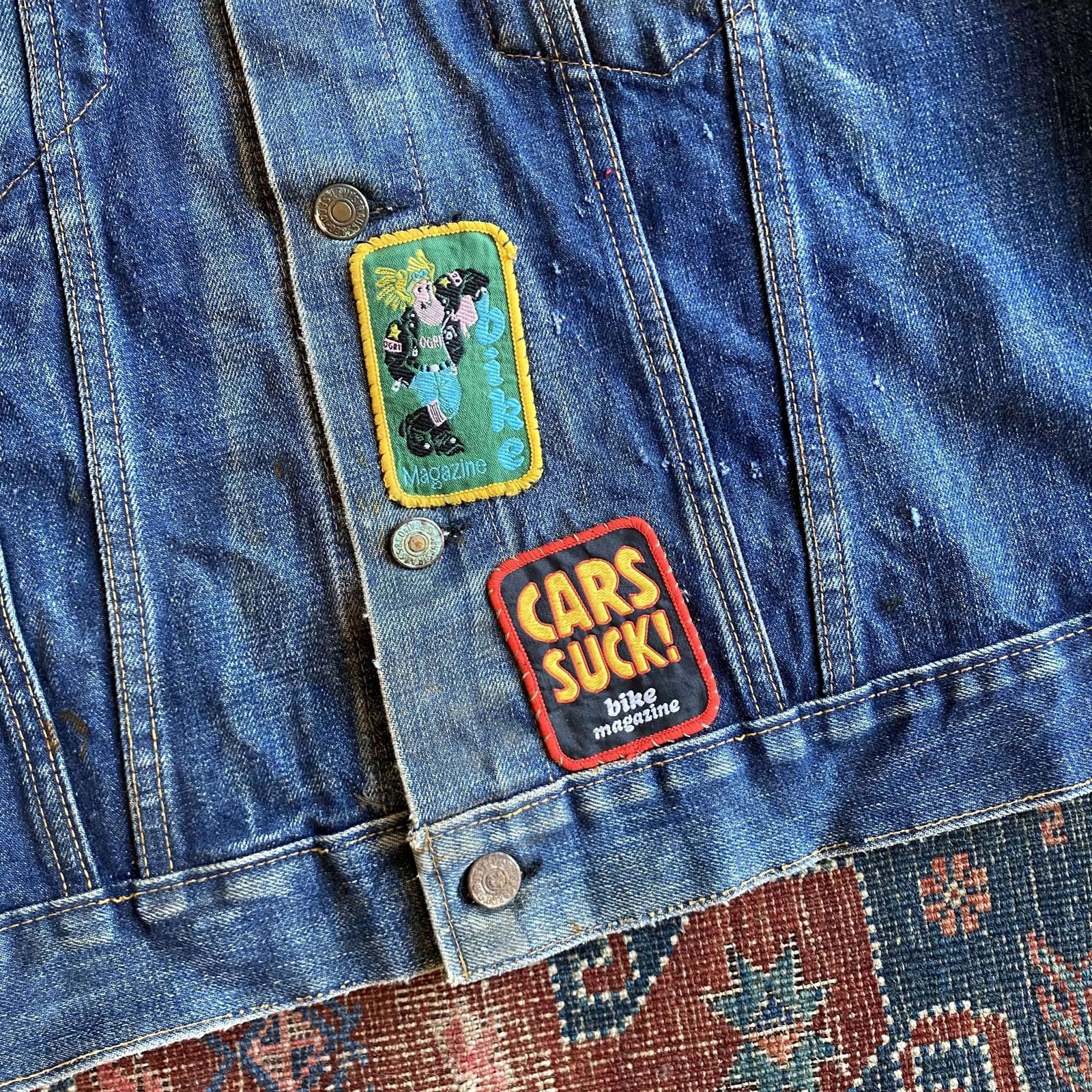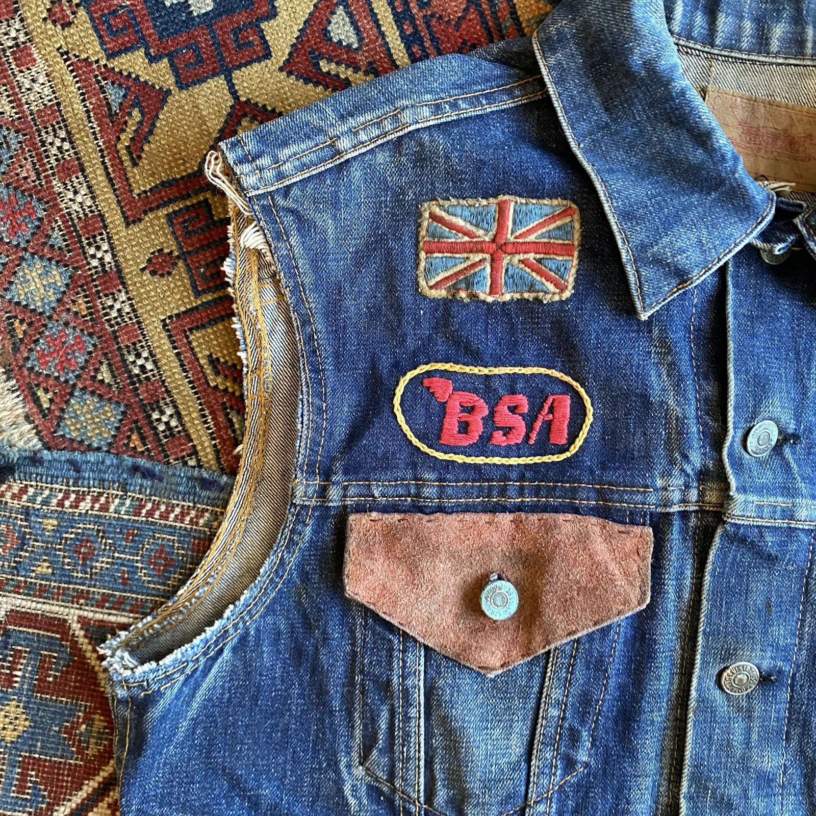 Pre 1971 Levi’s Big E mid wash denim Type III cut off gilet. Amazing original motorcycle magazine & Status Quo World Tour patches. Hand embroidered BSA logo and custom suede pocket tabs. An amazing unique and well loved piece. Signs of natural wear throughout, some rusting/oxidisation to the buttons (see pics) but still plenty of life left! Made in USA. A great rare and original piece. Sized as a Large/42” chest. Please check below measurements before purchasing.