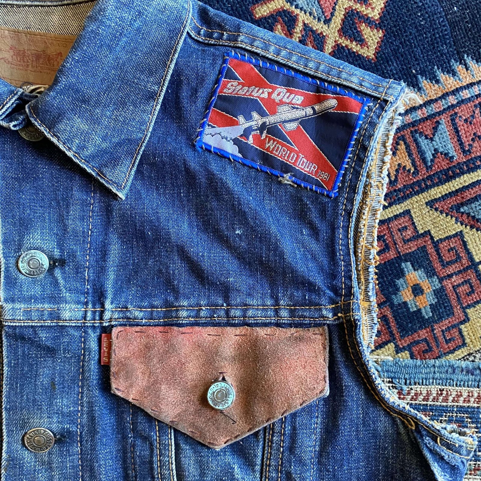 Rare Pre 1971 Levi’s Big E mid wash denim Type III cut off gilet. Amazing original motorcycle magazine & Status Quo World Tour patches. Size Large/42” chest.