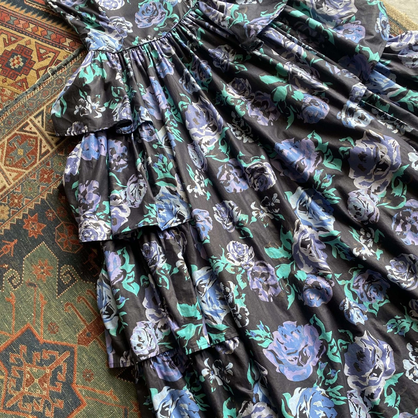 Vintage Laura Ashley 100% cotton floral fabric in a strapless regency style tiered style. Super full skirt with tiered side ruffles. UK size 10.